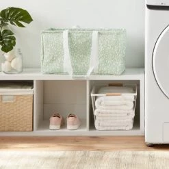 The Scrunchable Laundry Tote from Brightroom™ makes it easy to transport your clothes to and from the laundry room. This laundry tote is designed in a light green hue with white flecks and textured fabric for a bright, fun look. It’s equipped with side handles for easy carrying, and the interior zipper pocket provides a bit of extra space for socks, underwear or other small clothing items. Best of all, it can be folded flat when you aren’t using it to save storage space.